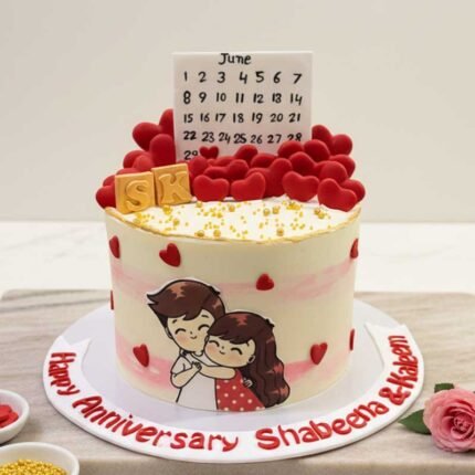Design Elements: The cake includes a “June” calendar with a red heart marking June 18th, golden “SK” initials, numerous red heart