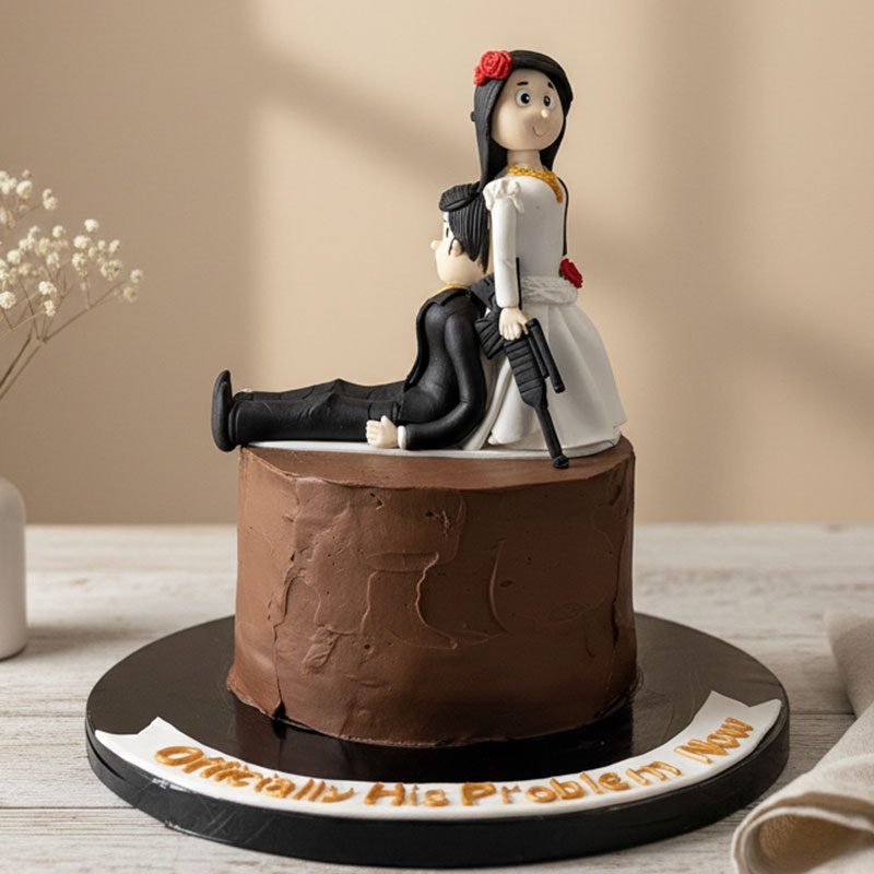 - Message: A fondant banner at the base reads, “Officially His Problem Now,” a play on traditional wedding sentiments.